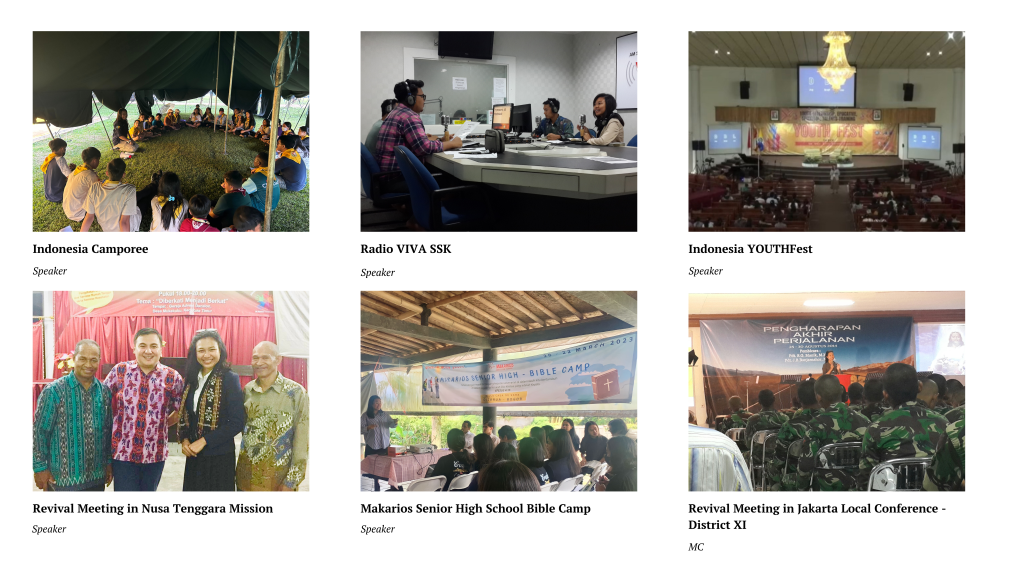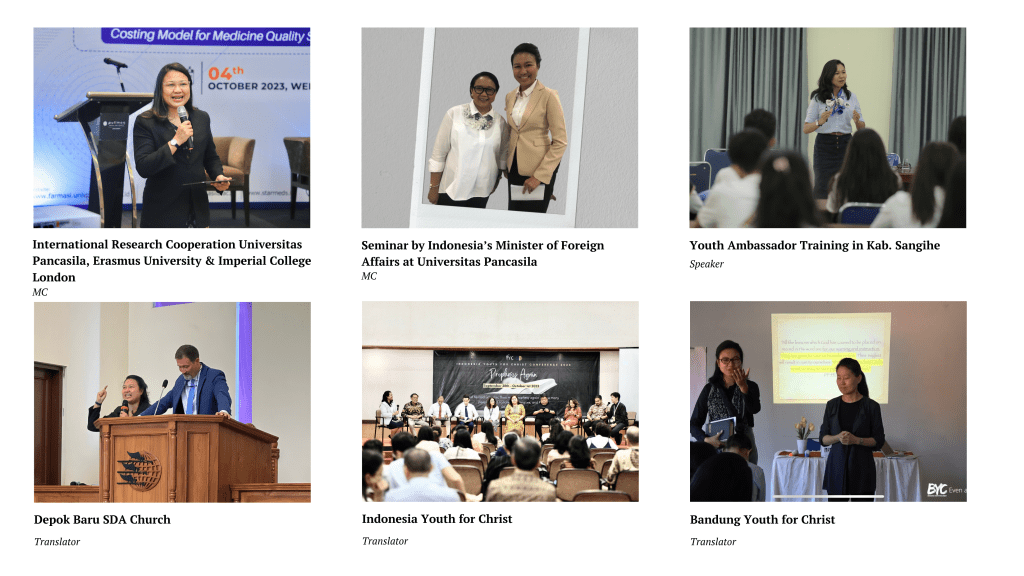 Alongside my ‘law’ journey, I received training and certification in public speaking and behavior development, and my experience as Miss Tourism Indonesia of North Sulawesi Province 2013, Wakil I Noni Sulut 2013 and Momo Sangihe 2013, has opened doors for me to be invited to serve as a master of ceremonies and speak at various events about public speaking/interpersonal communication, tourism, manners, etc. Since 2006 and after getting various bible and leadership training, I have been actively involved in church ministries such as leading youth, preaching, translating, teaching Bible studies, and mentoring young people across North Sulawesi and the West Indonesia Union Mission.